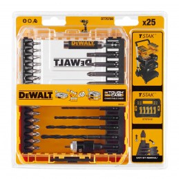Embouts 25mm: Ph2 x2, Pz2 x5, Pz3 x2, T10 x1, T15 x1, T20 x1, T25 x2, T30 x1? Embouts 50mm: Ph2 x1, Pz2 x1, T25 x1, T30 x1? Forets métal: 3mm x1, 4mm x1, 5mm x1, 6mm x1? te-embouts compact? Guide magnétique compact? Porte-embouts magnétique Retrait de l'embout facile et maintien assuré pendant l'utilisation. Verrouillage d'embout pour éviter leur perte quand ils ne sont pas en utilisation Pointe de l'embout optimisée pour plus de précision Tête de l'embout conçue pour éviter les dérapages pendant le vissage Inclus un guide de vissage allongé pour plus de stabilité et de contrôle, un porte-embouts et une sélection d'embouts hexagonaux et de forets métal Compatible TSTAK pour garder tous vos coffrets d'accessoires au même endroit Le coffret contient: Embouts 25mm: Ph2 x2, Pz2 x5, Pz3 x2, T10 x1, T15 x1, T20 x1, T25 x2, T30 x1 Embouts 50mm: Ph2 x1, Pz2 x1, T25 x1, T30 x1 Forets métal: 3mm x1, 4mm x1, 5mm x1, 6mm x1 Guide magnétique compact Porte-embouts compact Accessoires indispensables pour votre perceuse visseuse DEWALT