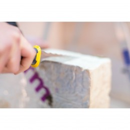 Poignée bimatière antidérapante pour une meilleure prise en main-Trou pour un rangement et transport facile-Lame inox (anticorrosion)-Long. 350 mm-Epaisseur 2 mm-Denture dentelée / vague : pour matériaux souples type laine de verre/Isolation grenier/combles-Denture fine pour matériaux durs / forte densité / Isolation mur/cavité