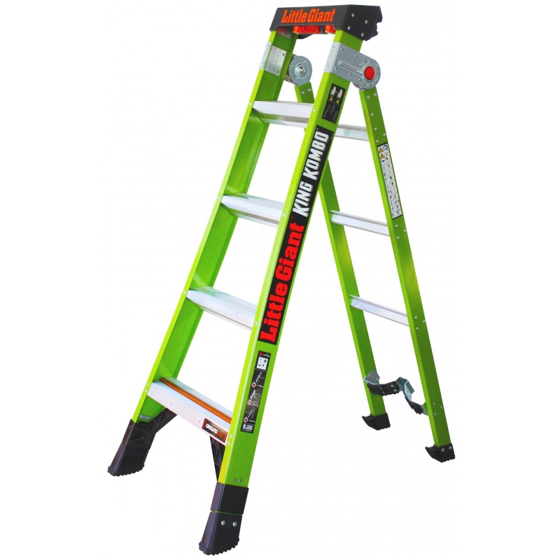 Le King Kombo 4 marches offre une hauteur maximale d'accès de 2,1m en escabeau et de 3m en extension. 3 en 1, à la fois échelle d’appui, escabeau et échelle en extension. En fibre de verre isolée. Équipé du Wallpad rotatif pour prendre appuis sur les murs et angles ouverts ou fermés. Équipé du système GroundCue pour réduire les risques d’accidents. Pieds en caoutchouc antidérapants et renforcés.