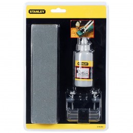1 guide d'affûtage, 1 pierre à huile, 1 flacon d'huile, Indicateur d'angle rabattable déterminant immédiatement l'angle désiré (25°, 30° ou 35°), Permet d'affûter tous les fers de rabots et ciseaux de largeur comprise entre 3 mm et 60 mm