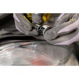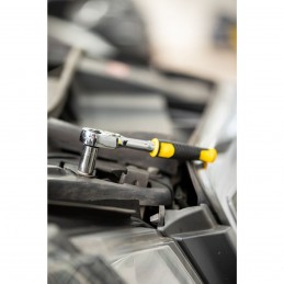 1/4" - Cliquet 72 dents pour un angle de reprise de 5°-Ejection facile et rapide des douilles avec un large bouton de déverrouillage en métal-Basculement pratique, rapide et sécurisé à l’aide du levier d’inversion en métal et utilisation à une main-Confort, prise en main et contrôle optimum avec un manche bi-matière et emplacements doigts anti-dérapants. Finition satinée brillante