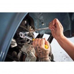 1 Cliquet 72 dents 3/8’’ + 10 Douilles 3/8" (12 pans) : 8 – 9 – 10 – 11 – 12 – 13 – 14 – 15 – 16 – 17 mm - Cliquet 72 dents pour un angle de reprise de 5° - Large bouton de déverrouillage en métal -Levier d’inversion en métal pour basculement rapide et sécurisé à une main