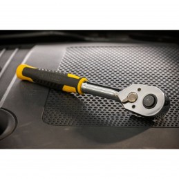 1/2" - Cliquet 72 dents pour un angle de reprise de 5°- Ejection facile et rapide des douilles avec un large bouton de déverrouillage en acier-Basculement pratique, rapide et sécurisé à l’aide du levier d’inversion en métal et utilisation à une main-Confort, prise en main et contrôle optimum avec un manche bi-matière et emplacements doigts anti-dérapants. Finition satinée brillante