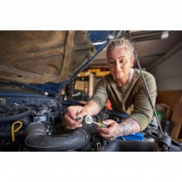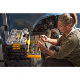 1 Cliquet 120 dents 3/8’’ FATMAX + 10 Douilles 3/8" (12 pans) : 8 – 9 – 10 – 11 – 12 – 13 – 14 – 15 – 16 – 17 mm sur rack métallique + 1 Porte-embout 3/8’’ pour embouts de visage ¼’’ + 10 Embouts de visage ¼’’ : PH0 – PH1 - PH2 –TT15-TT20-TT25-TT30-Fente : 3,5-4,5-8- Cliquet 120 dents pour un angle de reprise de 3°-Tête très compacte-Large bouton de déverrouillage en métal à faible épaisseur-Levier d’inversion compact, encastré