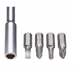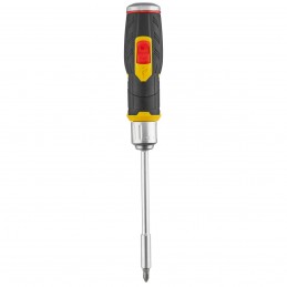 Maxi tournevis porte-embouts revolver à cliquet + 12 embouts fente : 5 mm, 6.5 mm, 8 mm / ph1-ph2-ph3 / pz1-pz2-pz3 / t10-t15-t20 + râtelier