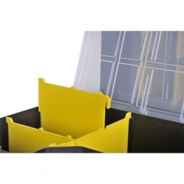 Accès simultané avec 3 compartiments dédiés : outillage à main - électroportatif - consommables. Ouverture à double crochets avec ressort pour plus de longévité. Couvercles transparents en plastique renforcé sur les 2 faces, avec encoches pour un maintien des outils durant le transport.