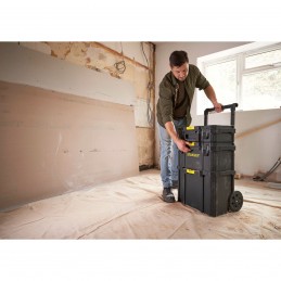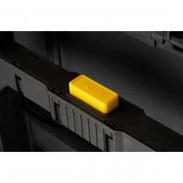 Connexion – déconnexion ultra rapide et facile avec un large bouton central pour se déconnecter en un seul geste-Boîte à outils compacte+Boîte à outils profonde avec porte-outils intégré+Coffre de chantier Maxi Volume-Larges attaches (liens) en métal-Roues avec revêtement caoutchouc de 18 cm-Large poignée télescopique-Possibilité de mettre un cadenas (non fourni)-Capacité 45kg/80L-51,2 x 41,2 x 76 cm