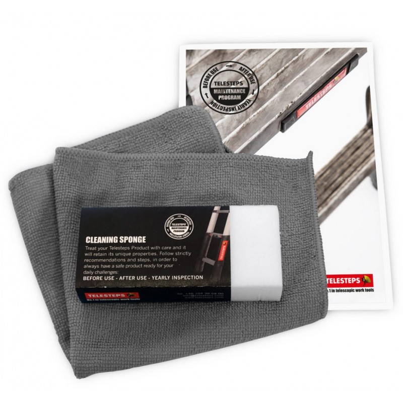Kit d'entretien Telesteps avec une serviette en microfibre de haute qualité, une éponge de nettoyage et les instructions d’entretien et le plan d’inspection annuel.