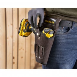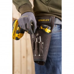 Cuir qualité supérieure, flexible et résistant. Solide avec renforcement par rivets, double couture piquée et renforcement des coins. Compatible avec tout type de ceinture-Pour droitier et gaucher-Sécurité : lanière en cuir pour maintenir l’outil en place-Poches dédiées aux embouts et forêts