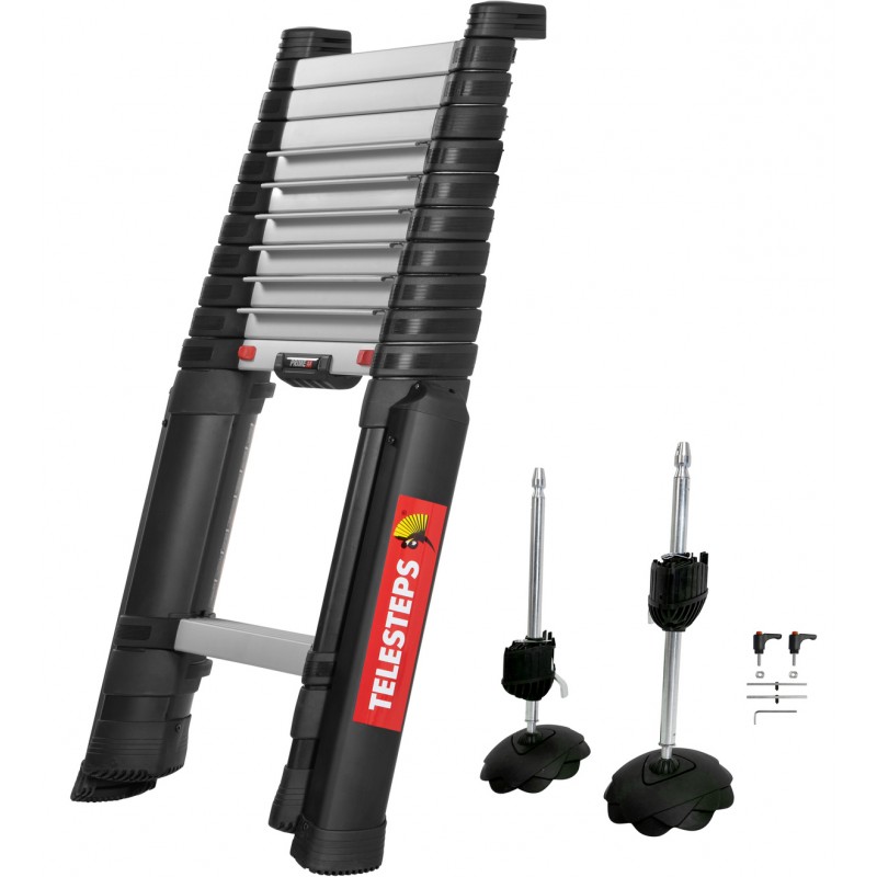 Echelle Telescopique Telesteps Prime 3,50m avec stabilisateurs latéraux. Hauteur d'accès 4,30m. Hauteur fermée 0,86m. Design triangulaire. Encombrement minimal. Aluminium anodisé. Avec paire de pieds de sécurité ajustable jusqu’à 22cm.