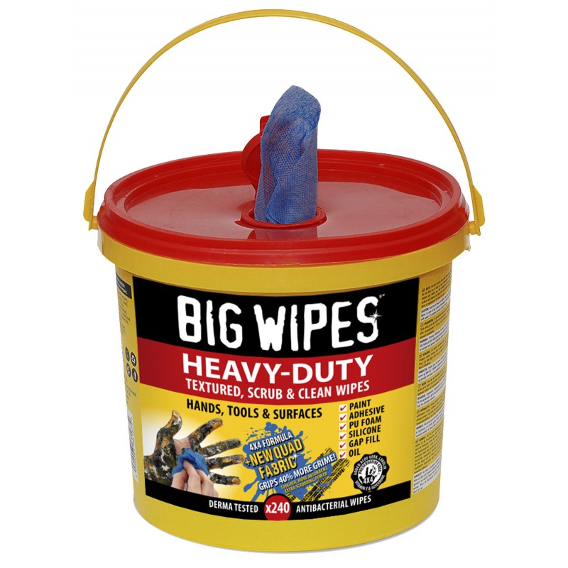 Big wipes heavy duty seau de 240 lingettes nettoyantes à haute performance biodégradable. Nettoyant puissant pour mousse expansée, peinture, adhésif, goudron et bitume, silicone, huile et graisse. Lotion sans conservateur aux 4 agents nettoyants et aux 4 agents hydratants testé dermatologiquement. Elle assure une protection antibactérienne à 99%. La lingette possède un tissu à la pointe de la tehnologie très absorbant avec ses 4 épaisseurs avec un coté lisse et un coté grippant.