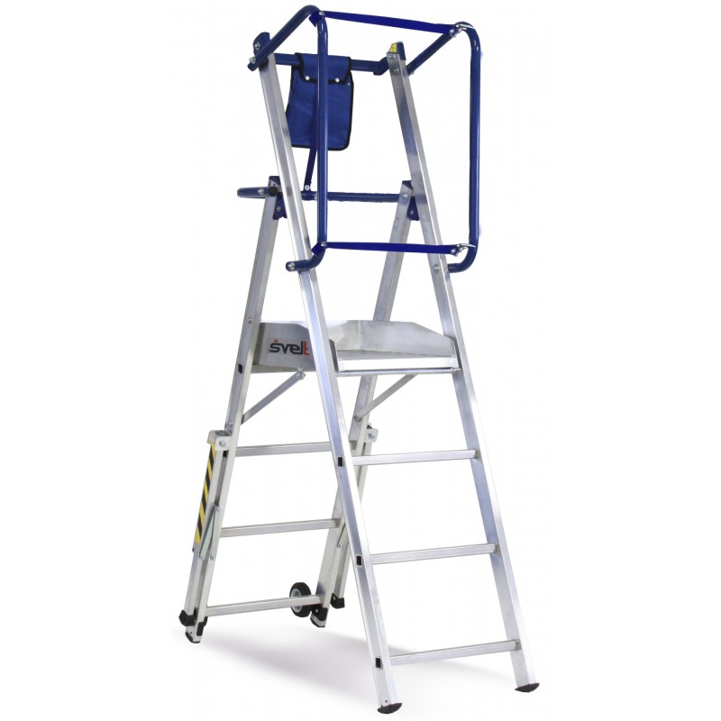 Plateforme aluminium Pir Légère 3 marches. Garde corps protégeant l'utilisateur des 4 côtés. Grande plateforme de sécurité avec rebords. Patins caoutchouc antidérapants. Sacoche à outils inclus et roues; Stabilisateur télescopique