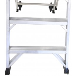 Plateforme aluminium Pir 5 marches. Garde corps protégeant l'utilisateur des 4 côtés. Grande plateforme de sécurité avec rebords. Patins caoutchouc antidérapants. Sacoche à outils inclus et roues. Stabilisateur télescopique.Sangle anti-ouverture avec crochet et échelle autostable debout une fois repliée.