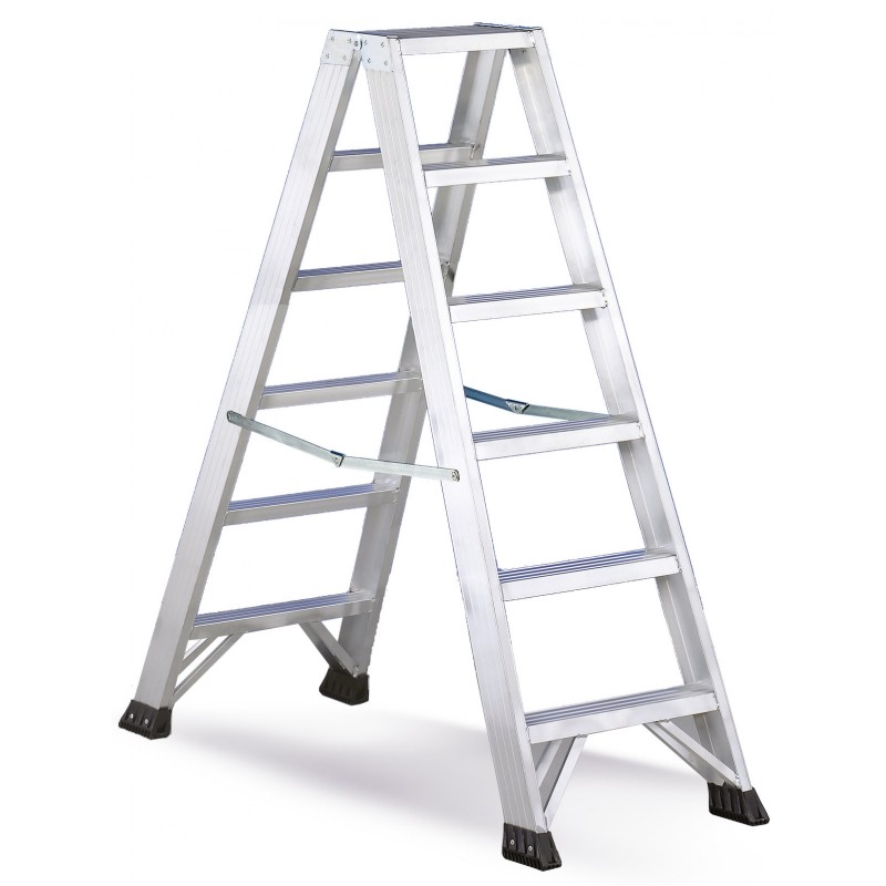 Escabeau double accès 6 marches. Marches antidérapantes. Barre de sécurité et charnière de verrouillage. Patins antidérapant caoutchouc.