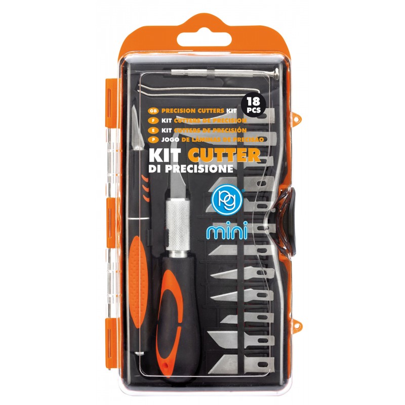 KIT SCALPEL DE PRECISION 18 PIECES: 1 poignée bi-matière antidérapente pour matériel léger et moyen avec attache rapide de la lame / 1 poignée bi-matière antidérapente pour matériel épais, avec attache rapide de la lame / 14 lames de precision / 1 tournevis de precision / 1 pince de precision