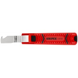 Pour dégainer tous les câbles ronds standard. Barrette d'arrêt autobloquante. Profondeur de coupe réglable grâce à la vis de réglage. Lame auto-pivotante pour coupe circulaire et longitudinale. Lame de rechange intégrée dans le boîtier. Bonne prise en main grâce à un revêtement souple antidérapant sur le manche et la barrette d'arrêt. Couteau à lame droite et lame crochet, livré avec capuchon protecteur. Boîtier: plastique, résistant aux chocs.