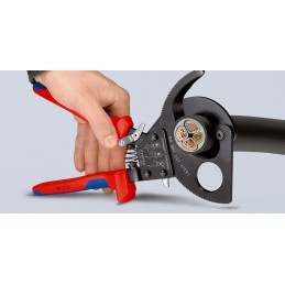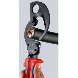 Pour couper les câbles en cuivre et en aluminium, unifilaires et multifilaires. Ne convient ni à la coupe du fil d'acier ni du câble métallique. Tranchants trempés, meulés avec précision. Coupe nette du câble et sans écrasement. Prise d'une seule main grâce au principe du cliquet. Effort physique réduit grâce à une démultiplication très élevée. Entraînement par couronne dentée à deux positions pour une coupe facile. Manipulation facile grâce à son poids faible et à sa conception compacte – utilisation également possible dans des espaces exigus. Ergot de protection évitant les pincements. Gaine de la poignée fixe avec surface d'appui pour poser la pince lors de la coupe. Pour conducteurs en aluminium jusqu'à 4 x 150 mm². Acier à outils de qualité spéciale, forgé, trempé à l’huile.