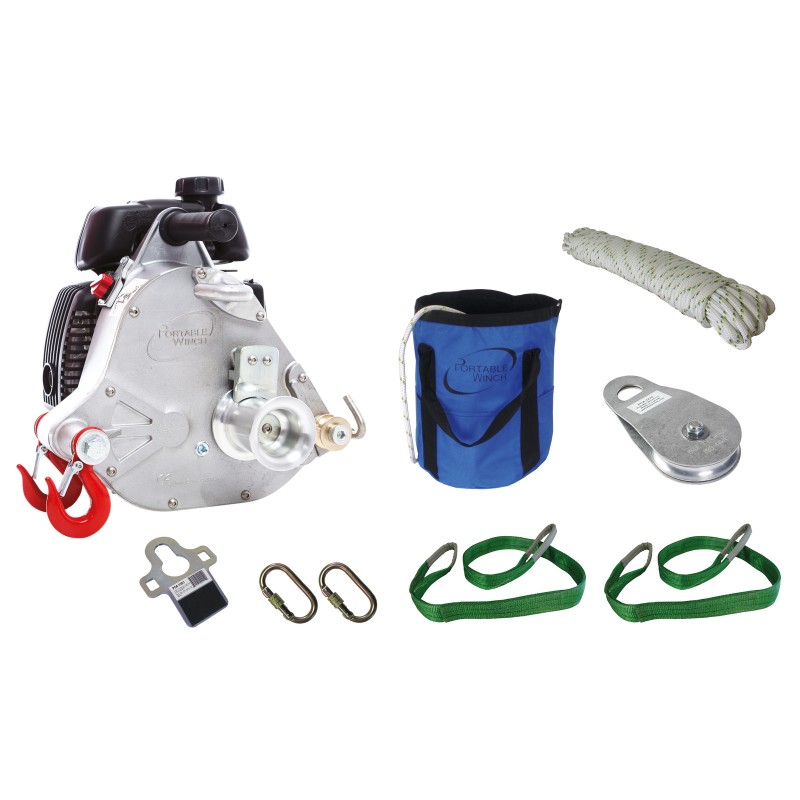 Ce kit comprend Treuil et élingue + Corde de polyester double tresse de 12 mm x 50 mètres+ petit sac à corde Cap.50 mètres+ Élingues de polyester 60mm x2m+ Plaque d’ancrage pour boule de remorquage + Poulies à côtés oscillants Ø100 mm+ 2 Mousquetons bloquants